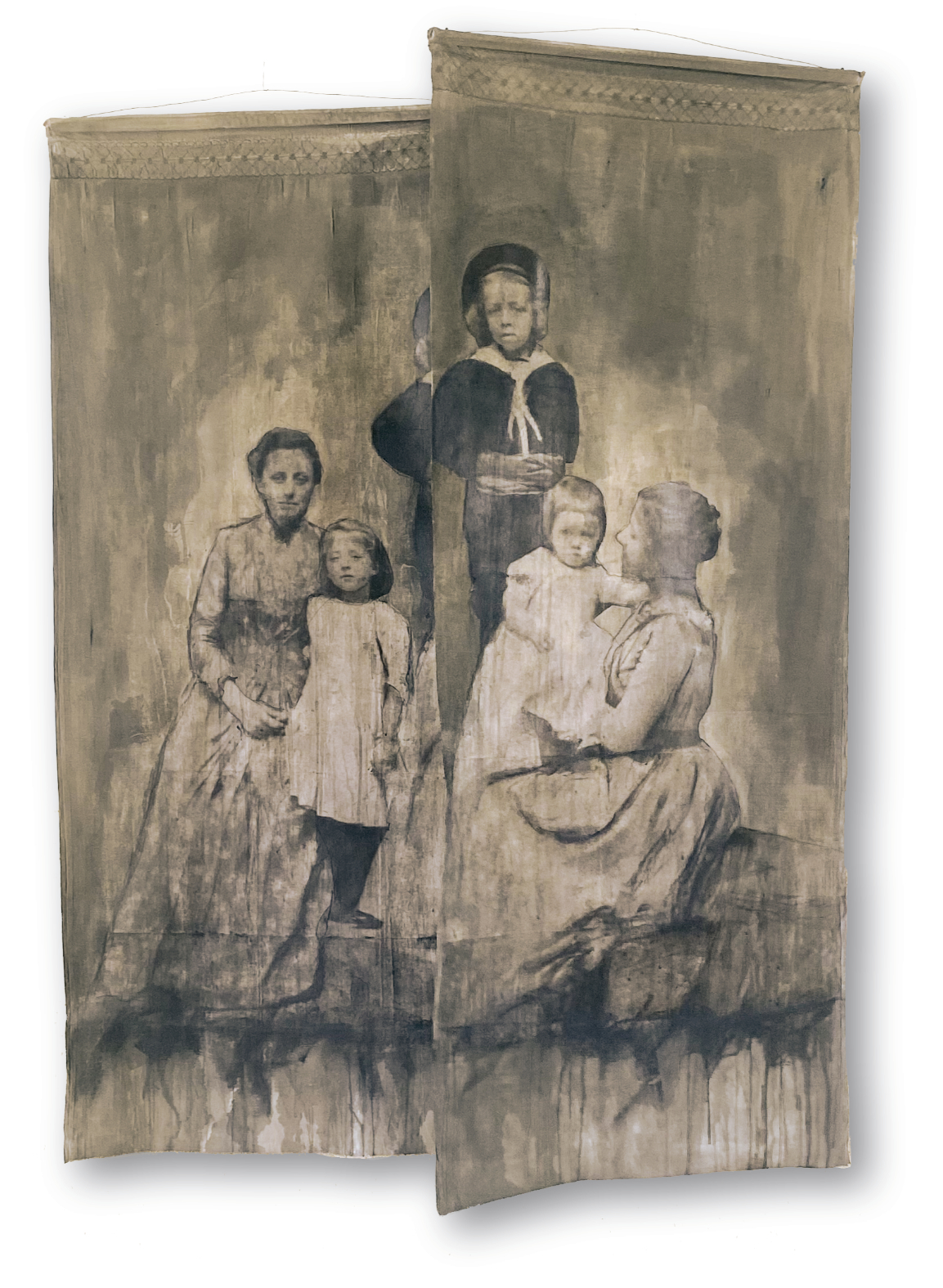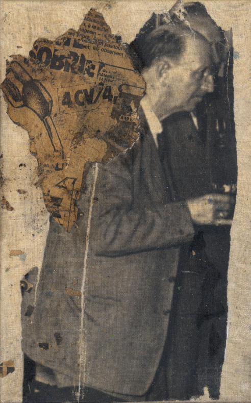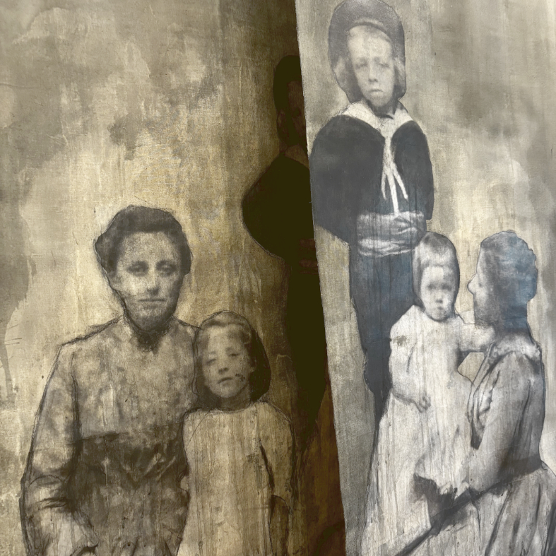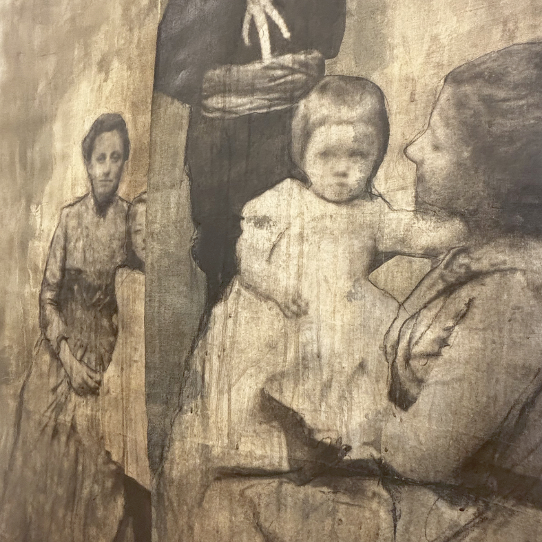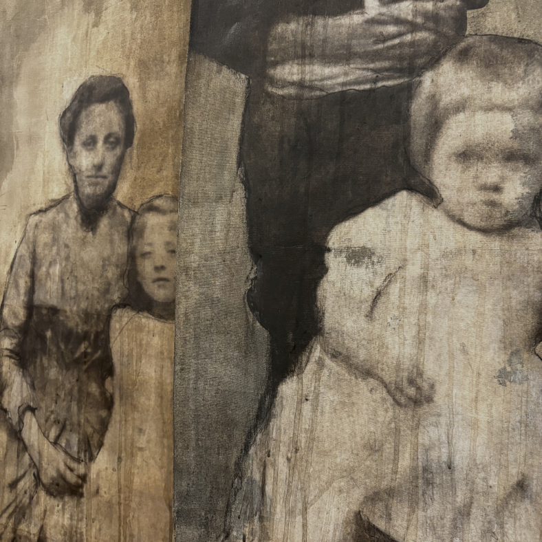 Technique: technique mixte, encre, fusain, photo ancienne, sur toile ancienne